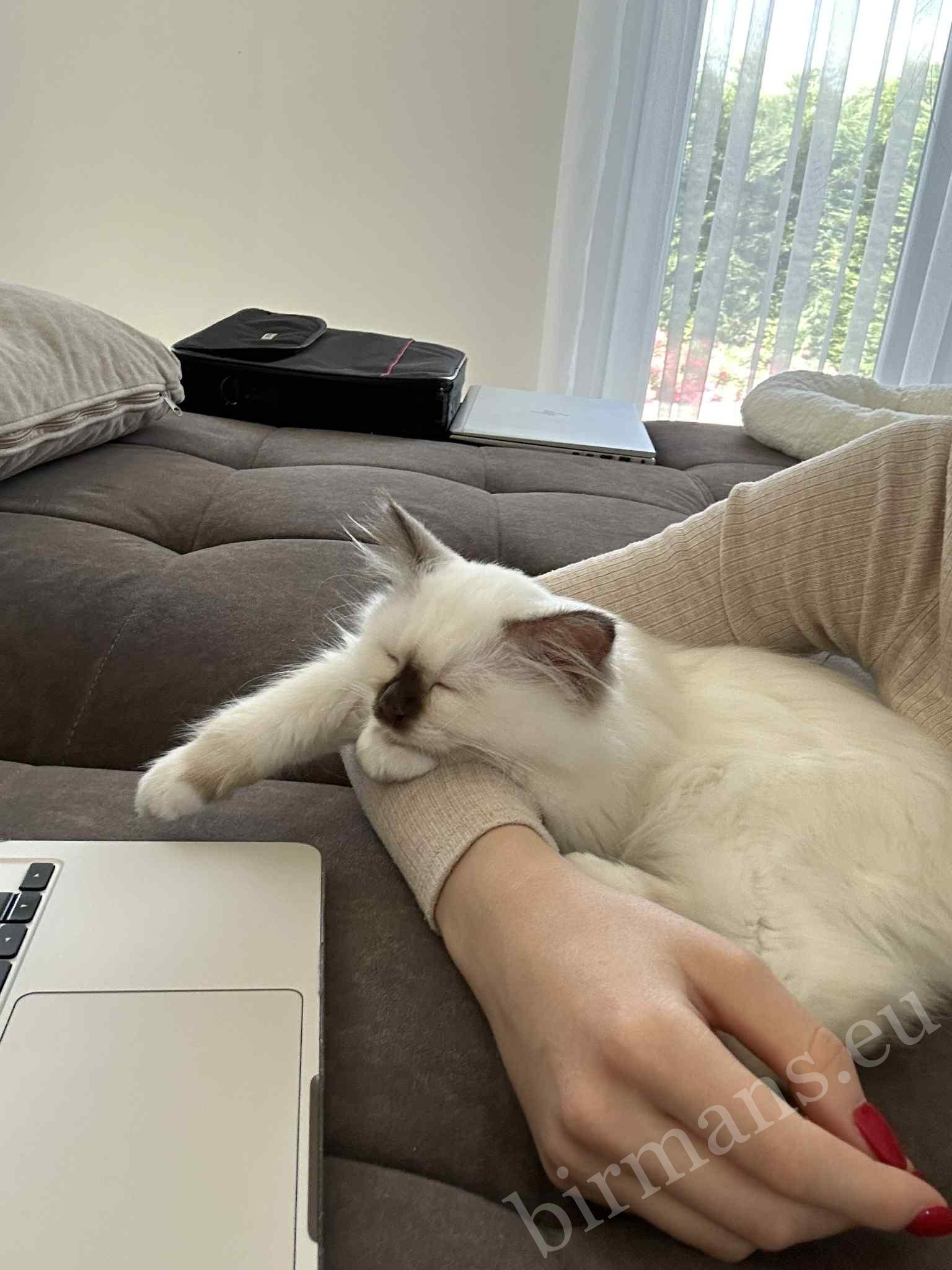 Un momento tranquilo entre Gigi y su dueña. El Sagrado de Birmania dormido en el regazo, descansando seguro, muestra exactamente esa conexión profunda y tranquila que es una de las cualidades más hermosas de la raza.
