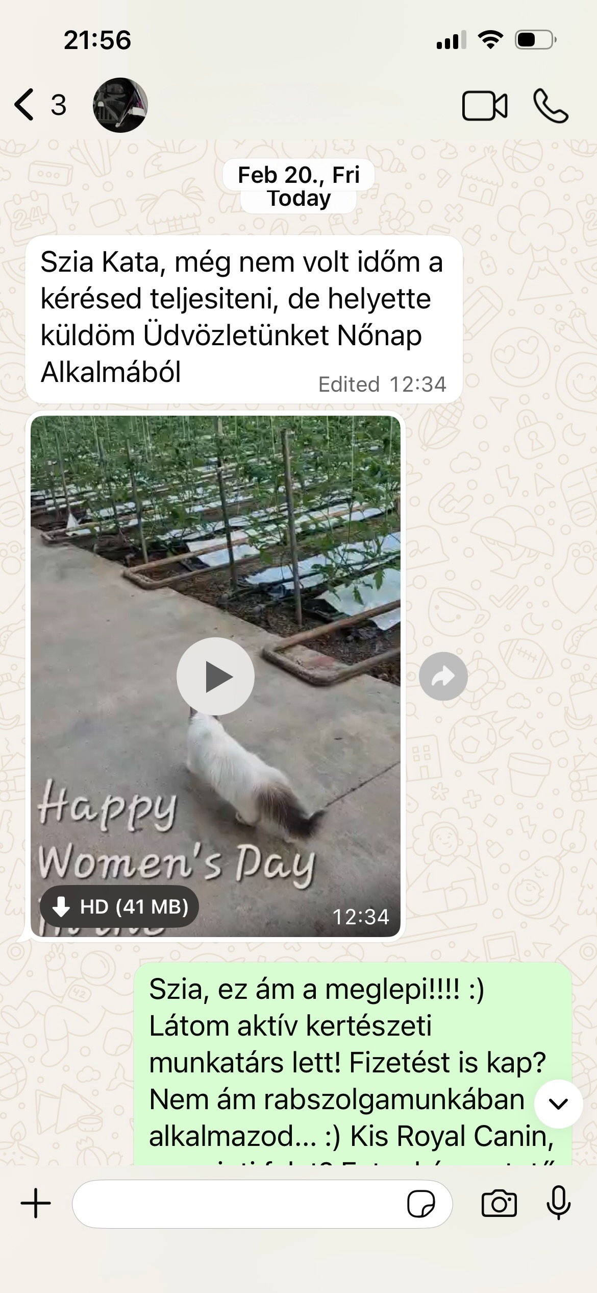 Gabriel, el dueño de Serenity, envió un breve vídeo en el que la gata lo acompaña en el invernadero mientras trabaja. El vídeo llegó como regalo del Día de la Mujer: un pequeño mensaje sobre cómo Serenity se convirtió en parte de la vida cotidiana.