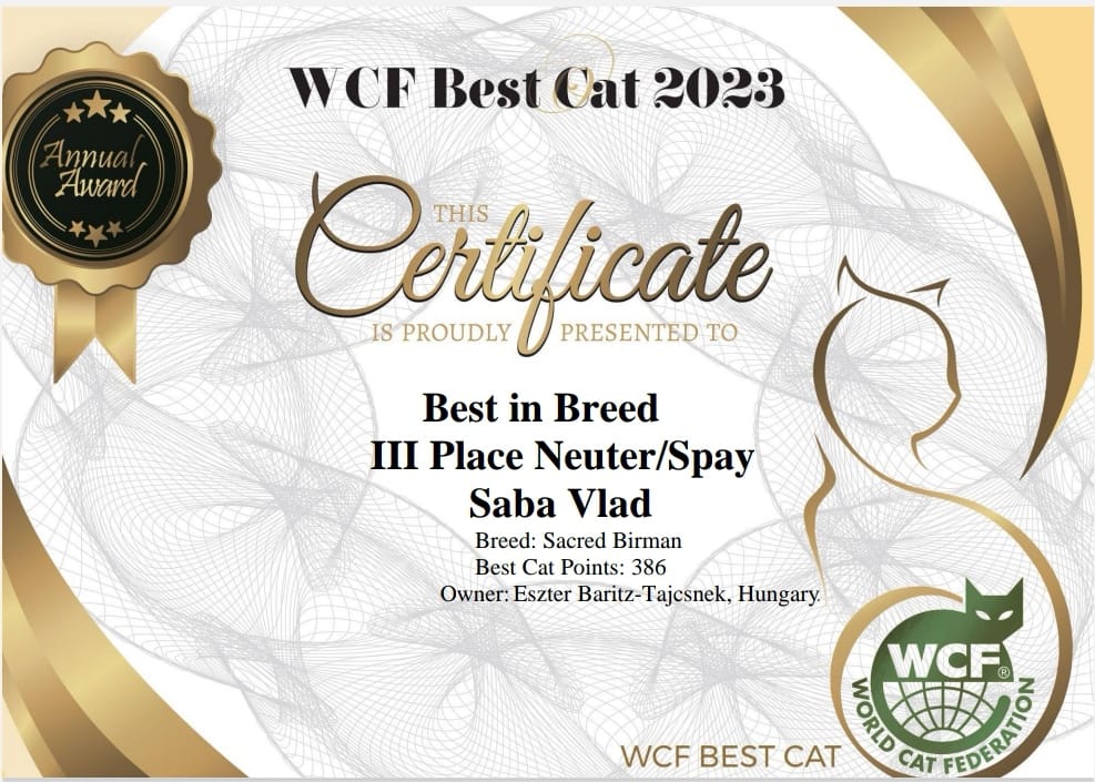 Saba Vlad – esto es lo que puede pasar cuando alguien tiene el impulso de competir con su gato: Vlad compite activamente en Hungría y en el extranjero, ¡y lo hace con éxito tras éxito! Es el 3er gato con más éxito del mundo en el sistema de la WCF, y también ha recibido un premio especial de juzgamiento del Presidente de la WCF. Ha ganado el Best In Show en numerosas competiciones y fue el 2º gatito más bonito de la exposición. ¡Vlad incluso apareció en Focus por sus logros!