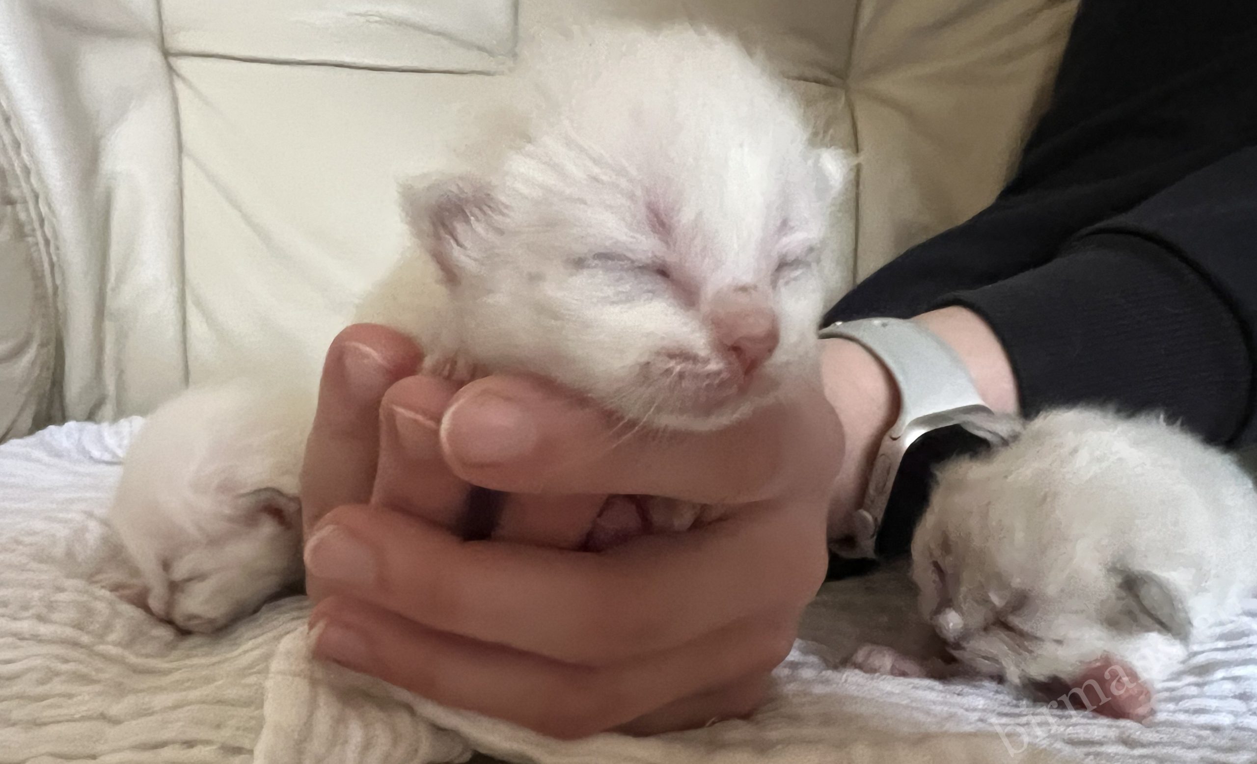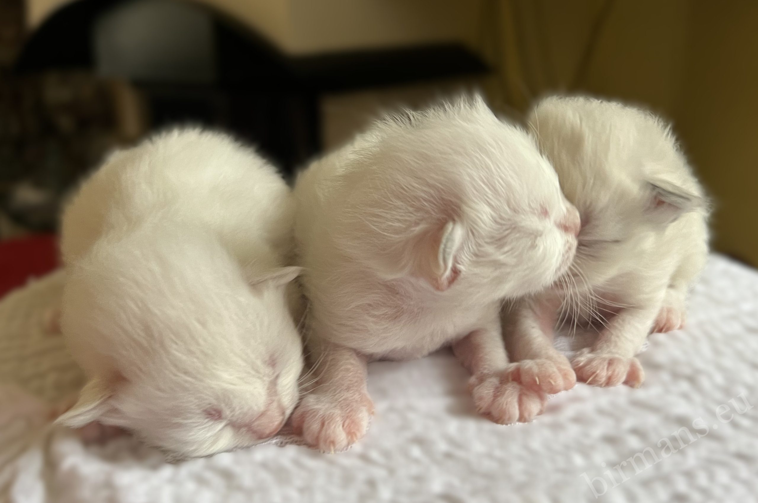 Gatitos Birmanos Saba recién nacidos de la camada W5 acariciados en Hungría