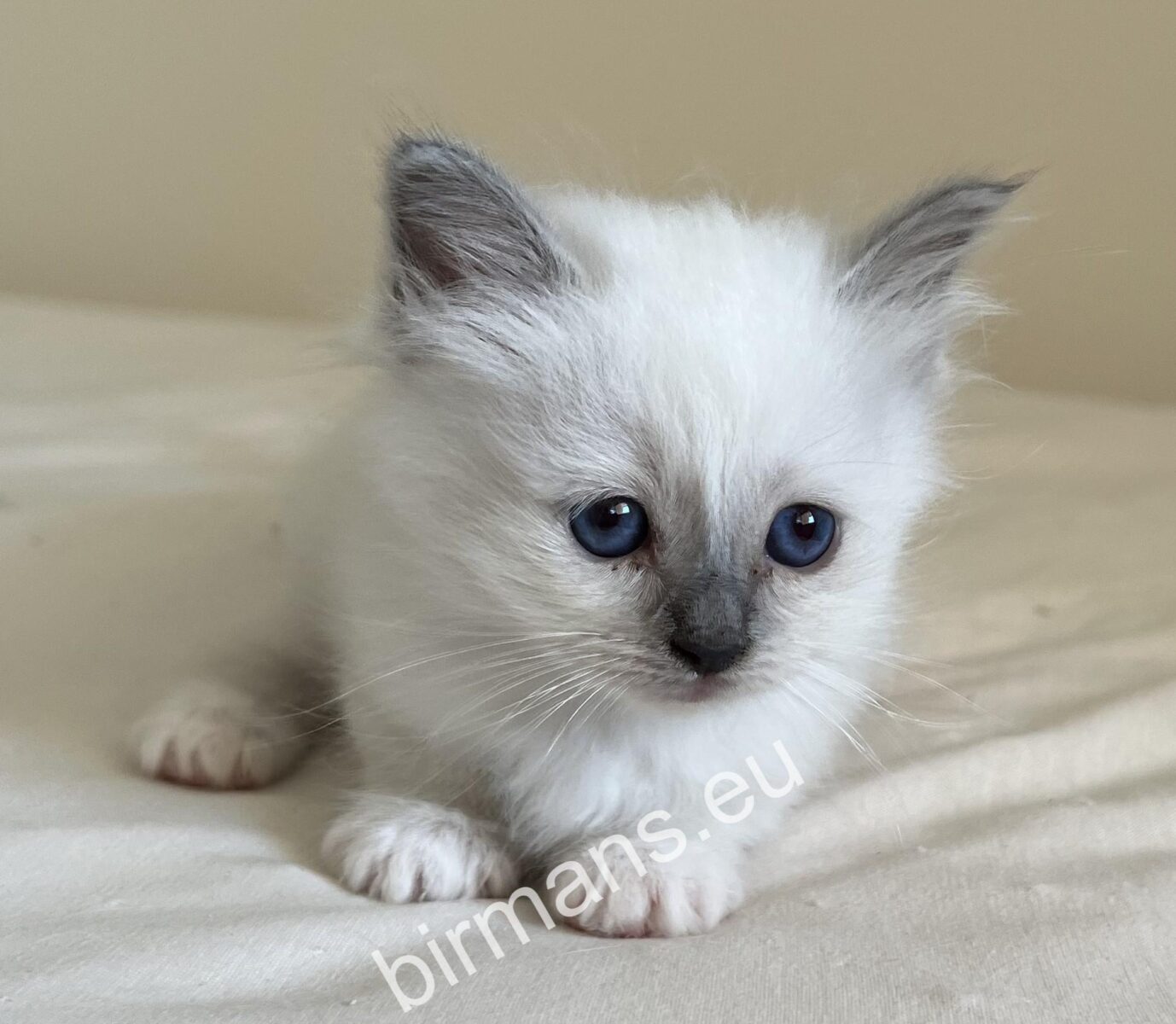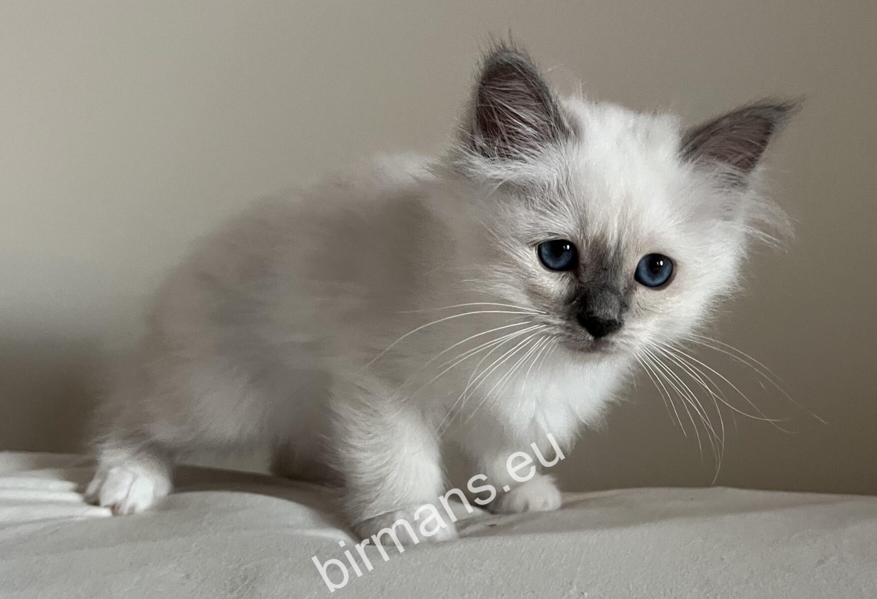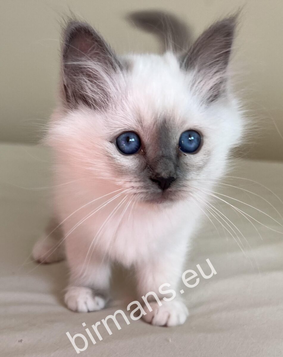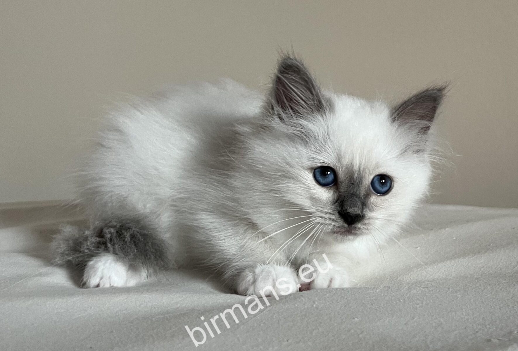 Esta perla lleva la distinguida belleza de la variedad Birman con asombrosa perfección: su dibujo de puntos azules y sus refinadas notas de espectáculo son impresionantes por sí mismas. Aunque al principio parece reticente, cuando se calma, se lanzará -y tu corazón- a por un pequeño morreo. Es la elección ideal para los criadores que buscan una calidad excepcional y para los que se preparan para una carrera en el mundo del espectáculo, para quienes son importantes tanto la calma como la elegancia.