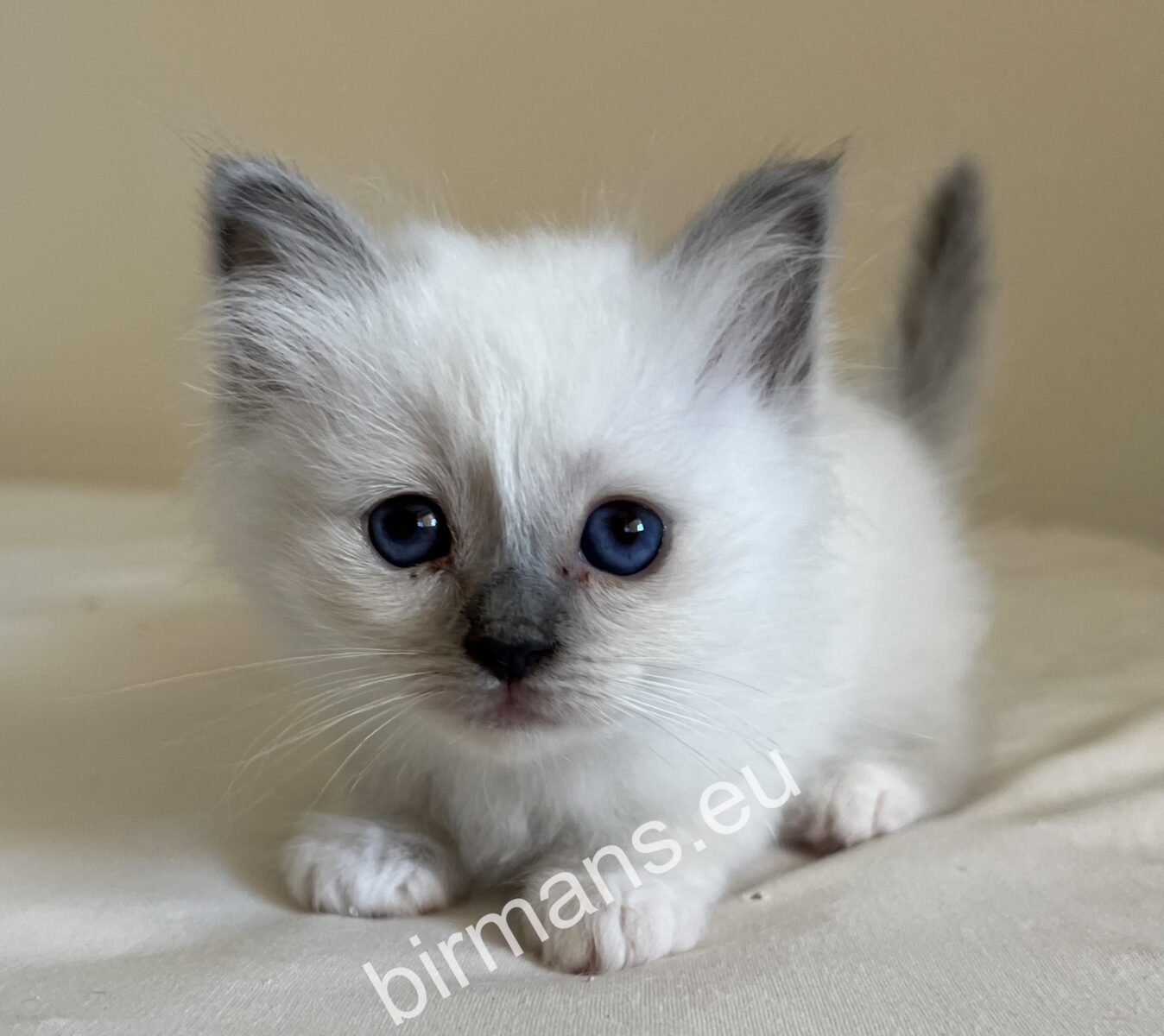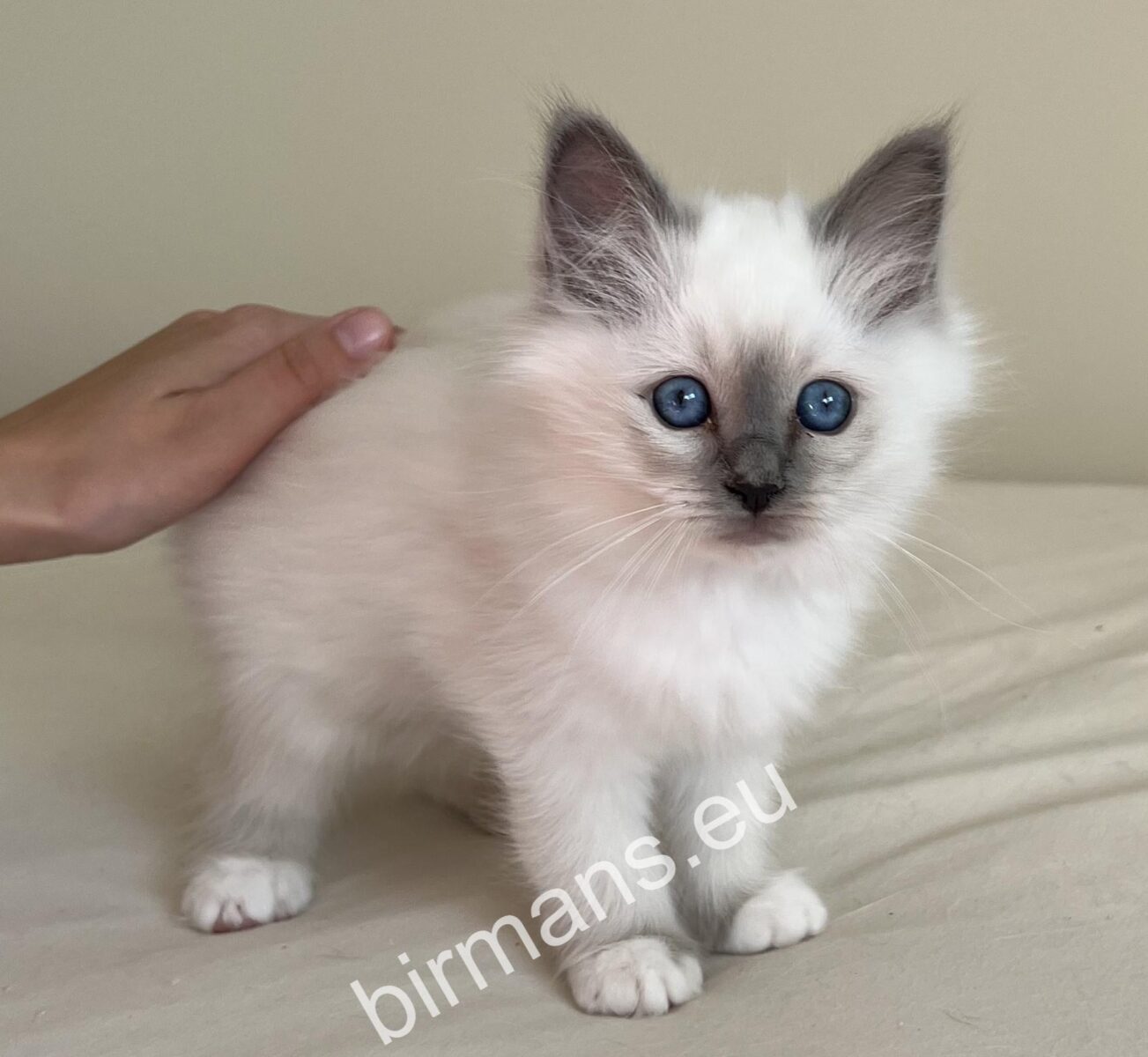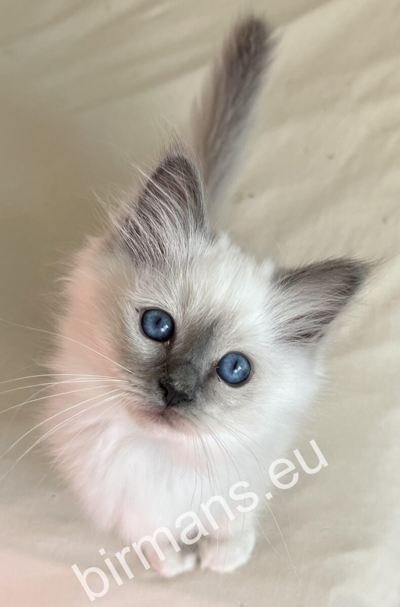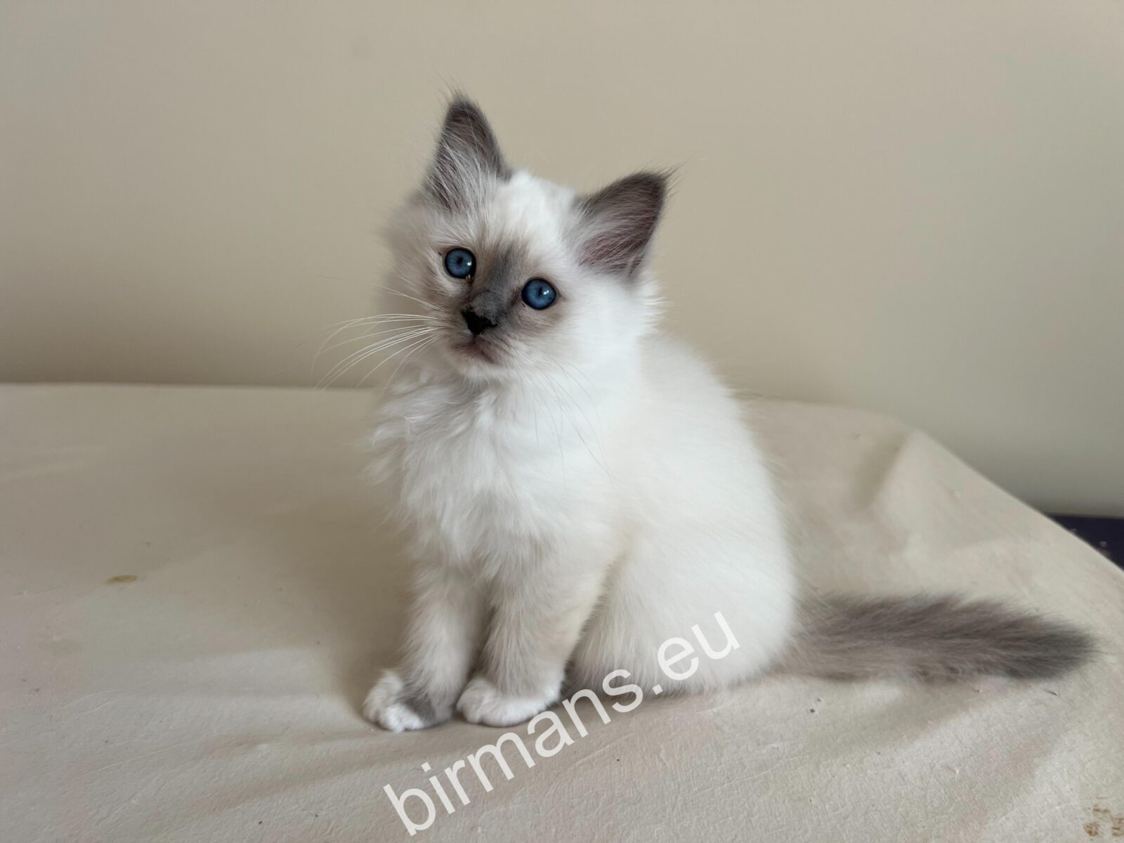 Esta perla lleva la distinguida belleza de la variedad Birman con asombrosa perfección: su dibujo de puntos azules y sus refinadas notas de espectáculo son impresionantes por sí mismas. Aunque al principio parece reticente, cuando se calma, se lanzará -y tu corazón- a por un pequeño morreo. Es la elección ideal para los criadores que buscan una calidad excepcional y para los que se preparan para una carrera en el mundo del espectáculo, para quienes son importantes tanto la calma como la elegancia.