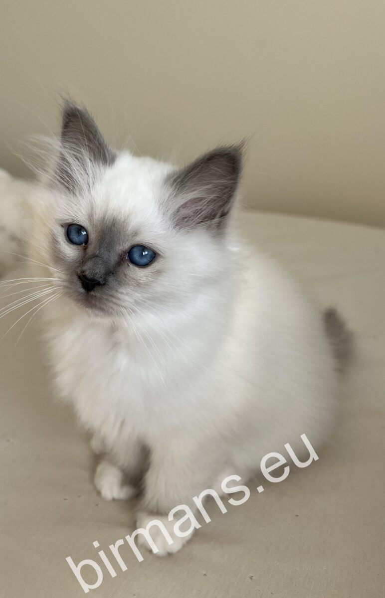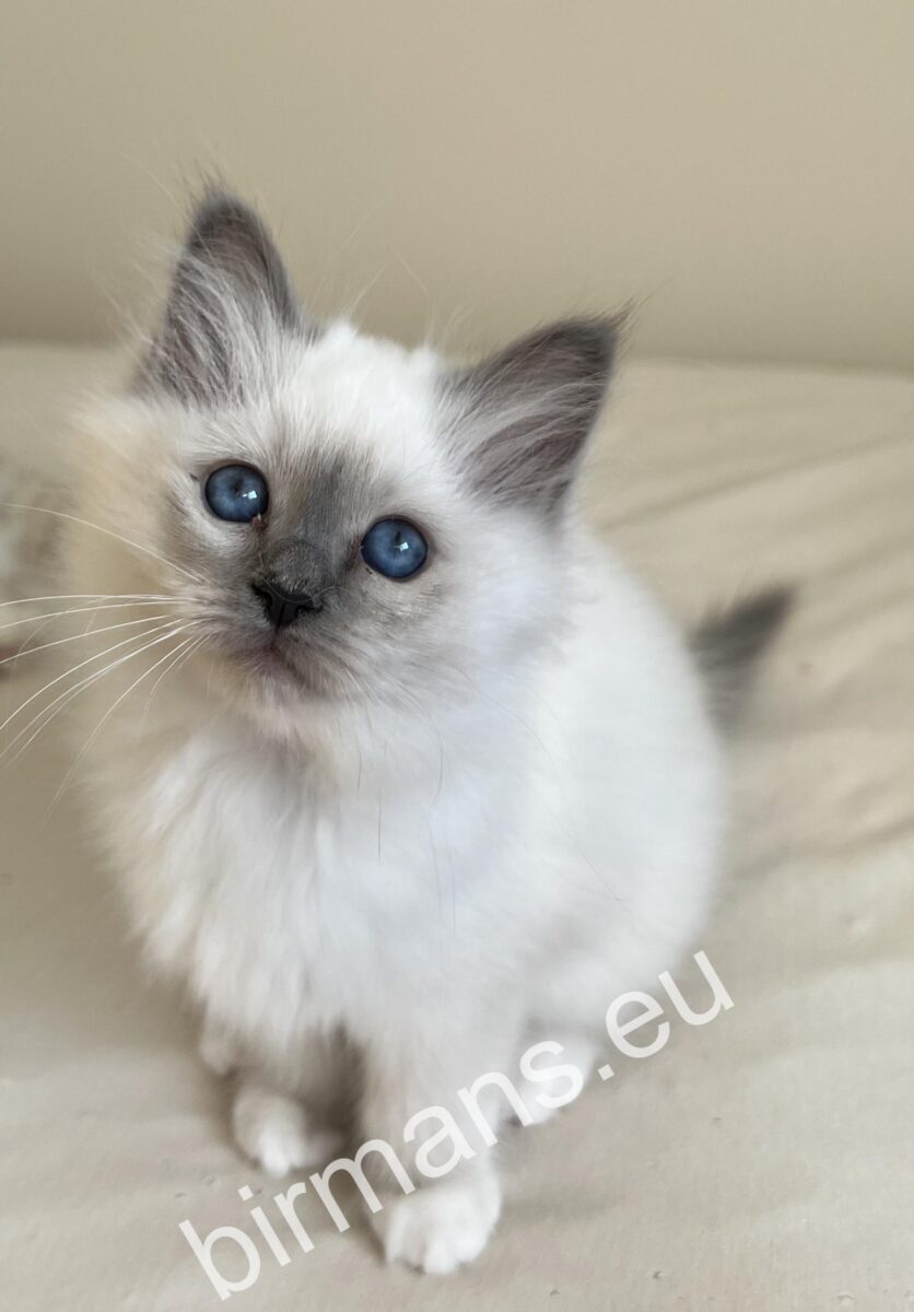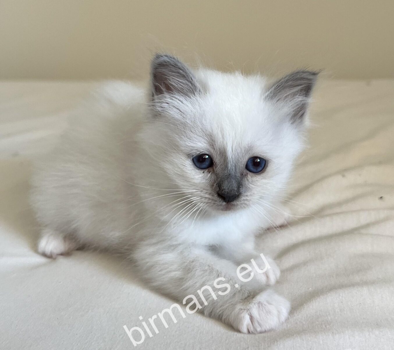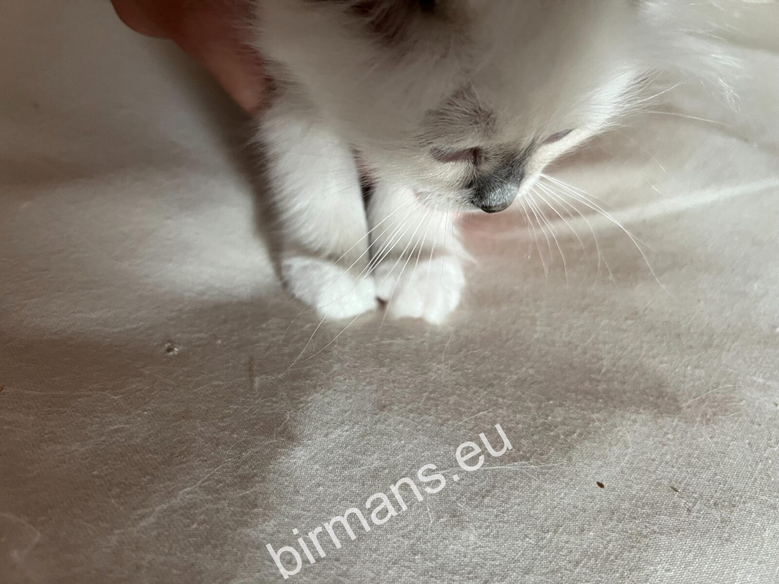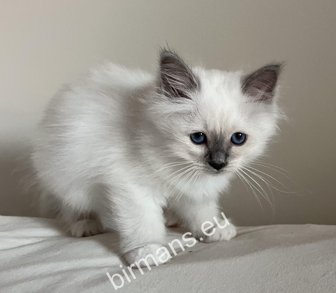 Esta perla lleva la distinguida belleza de la variedad Birman con asombrosa perfección: su dibujo de puntos azules y sus refinadas notas de espectáculo son impresionantes por sí mismas. Aunque al principio parece reticente, cuando se calma, se lanzará -y tu corazón- a por un pequeño morreo. Es la elección ideal para los criadores que buscan una calidad excepcional y para los que se preparan para una carrera en el mundo del espectáculo, para quienes son importantes tanto la calma como la elegancia.
