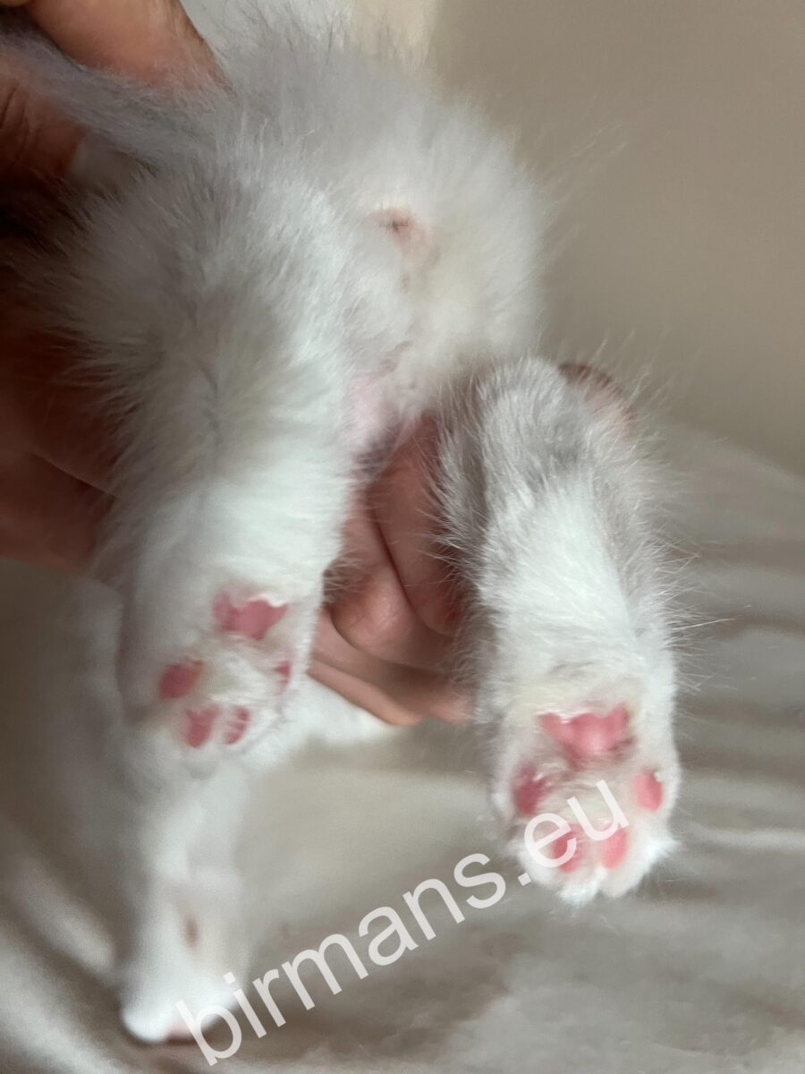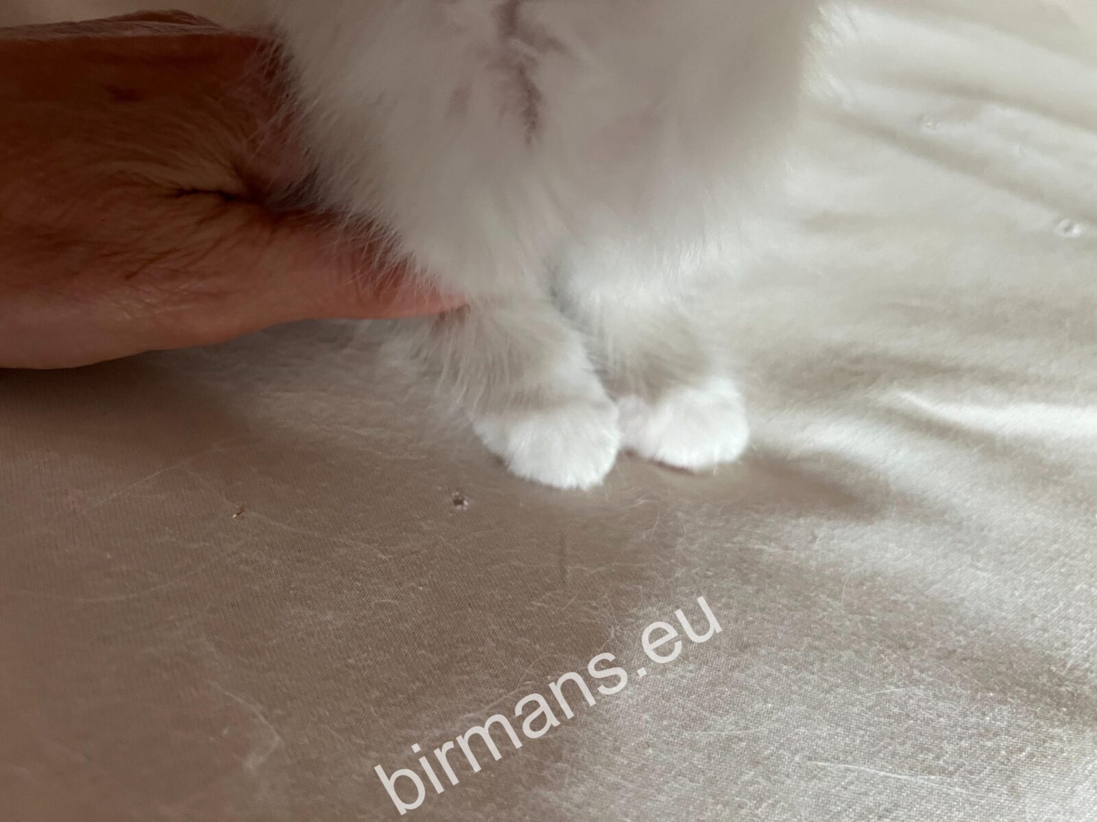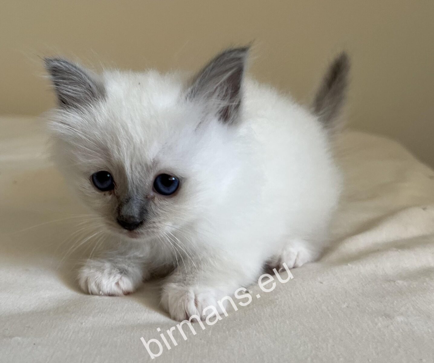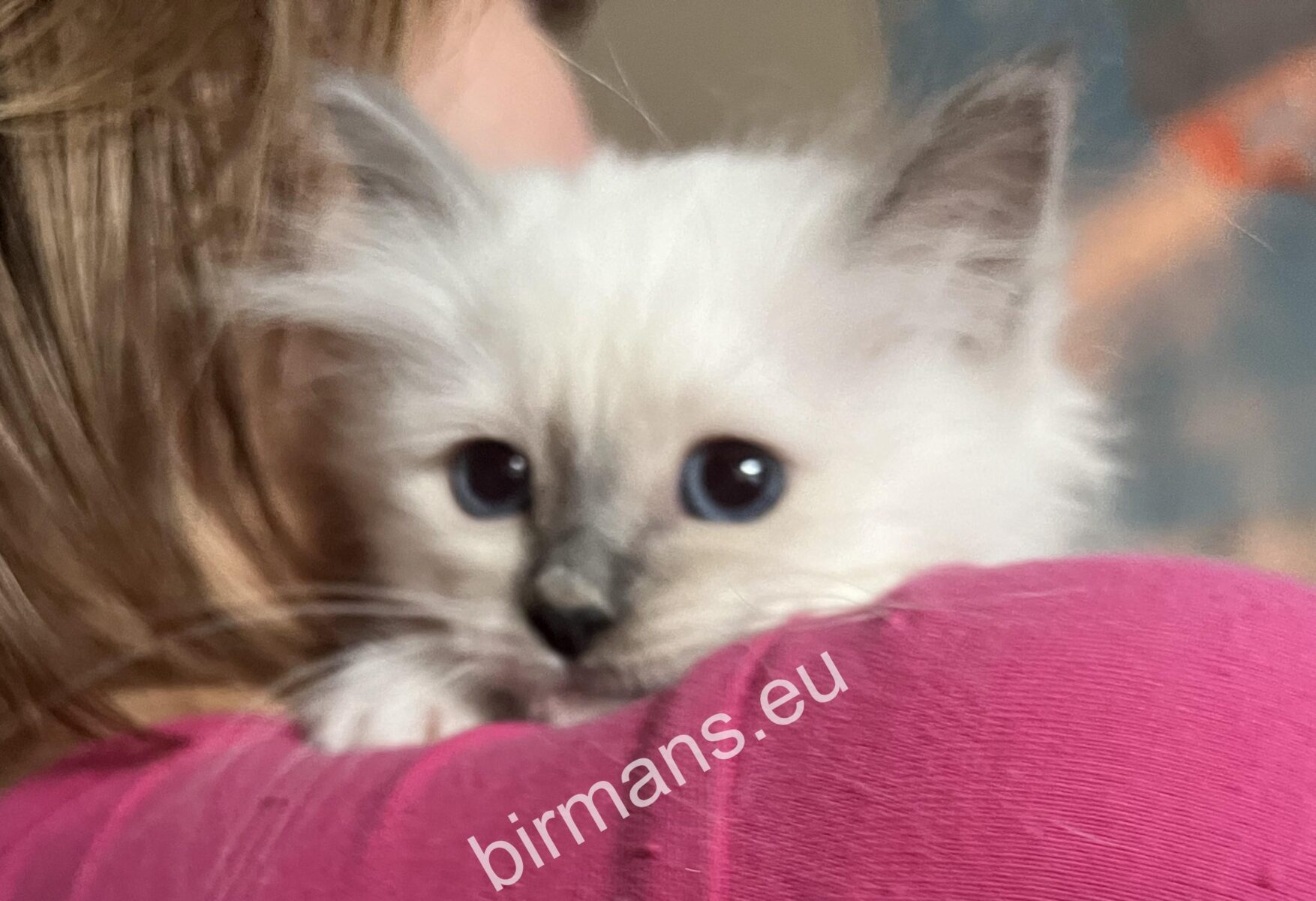 Esta perla lleva la distinguida belleza de la variedad Birman con asombrosa perfección: su dibujo de puntos azules y sus refinadas notas de espectáculo son impresionantes por sí mismas. Aunque al principio parece reticente, cuando se calma, se lanzará -y tu corazón- a por un pequeño morreo. Es la elección ideal para los criadores que buscan una calidad excepcional y para los que se preparan para una carrera en el mundo del espectáculo, para quienes son importantes tanto la calma como la elegancia.