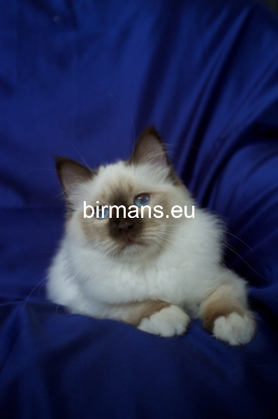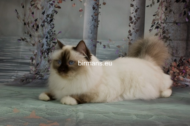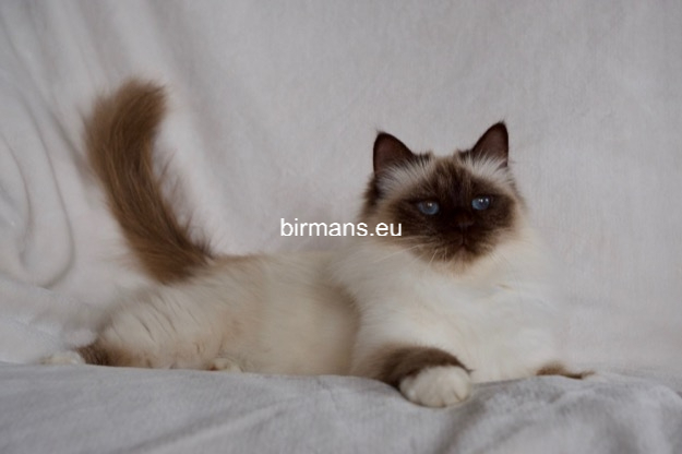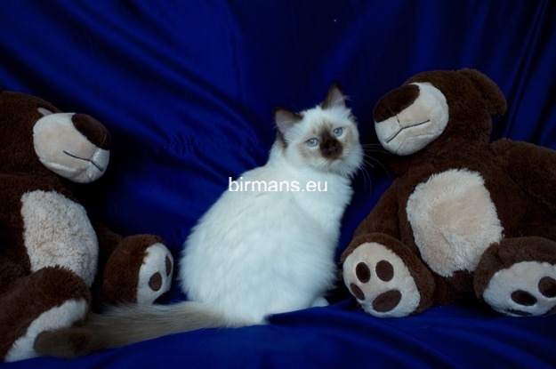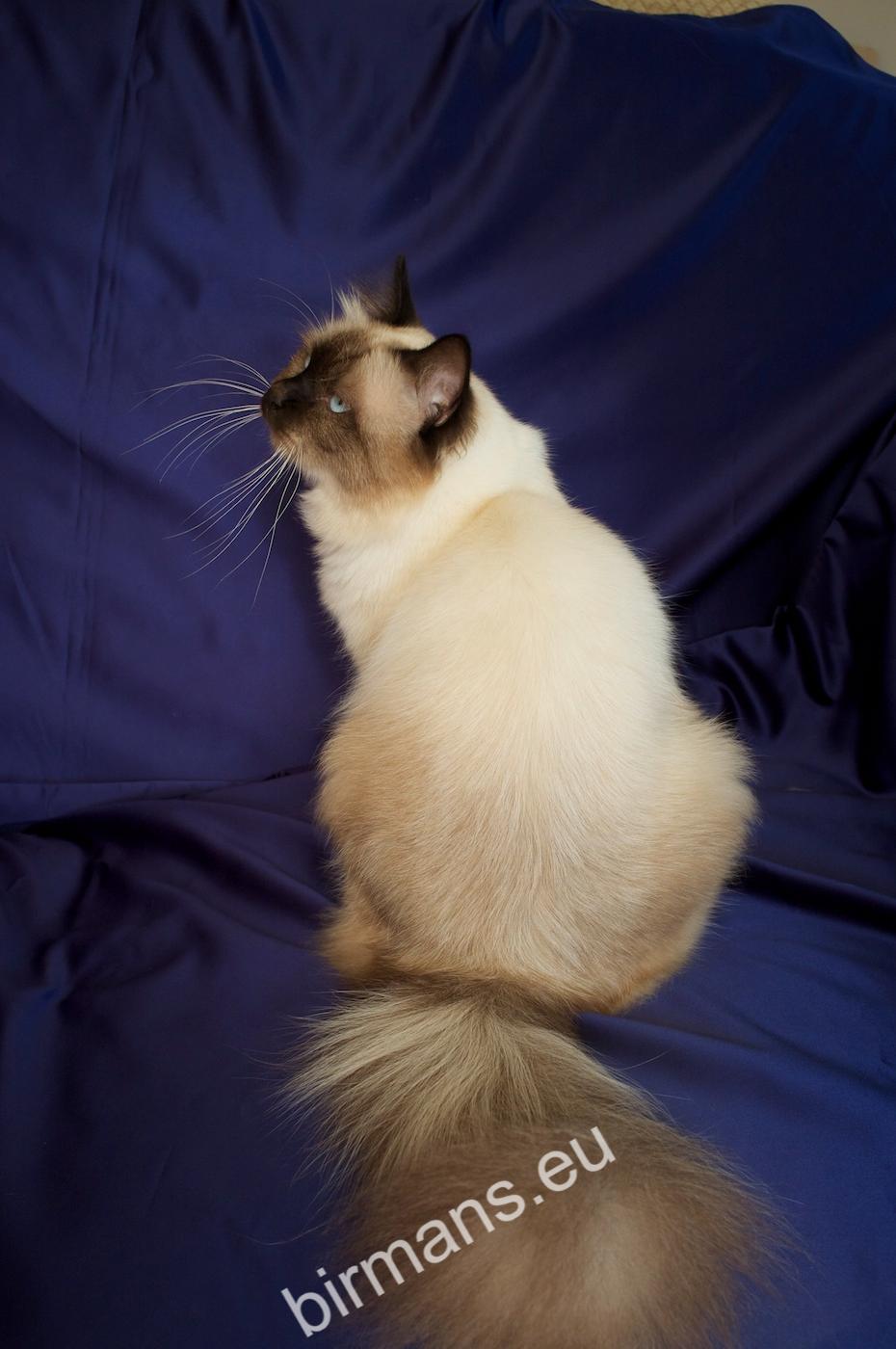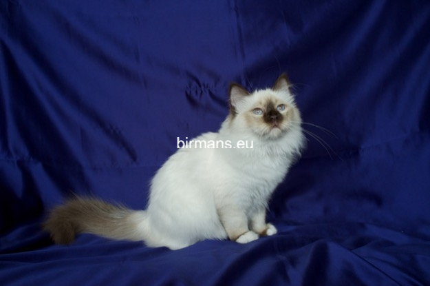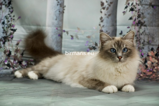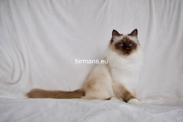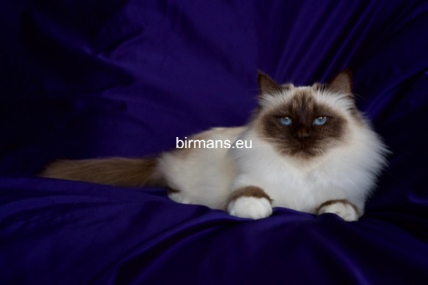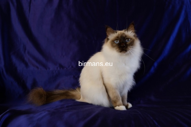 Los padres de Julia son el macho campeón del mundo Azzurro dei Baffi Buffi y Blue Sky Doroty, que es nuestra primera gata Birmana. El aspecto con carácter de Julia es aún más especial por sus rasgos atigrados, muy poco frecuentes en los tonos chocolate.