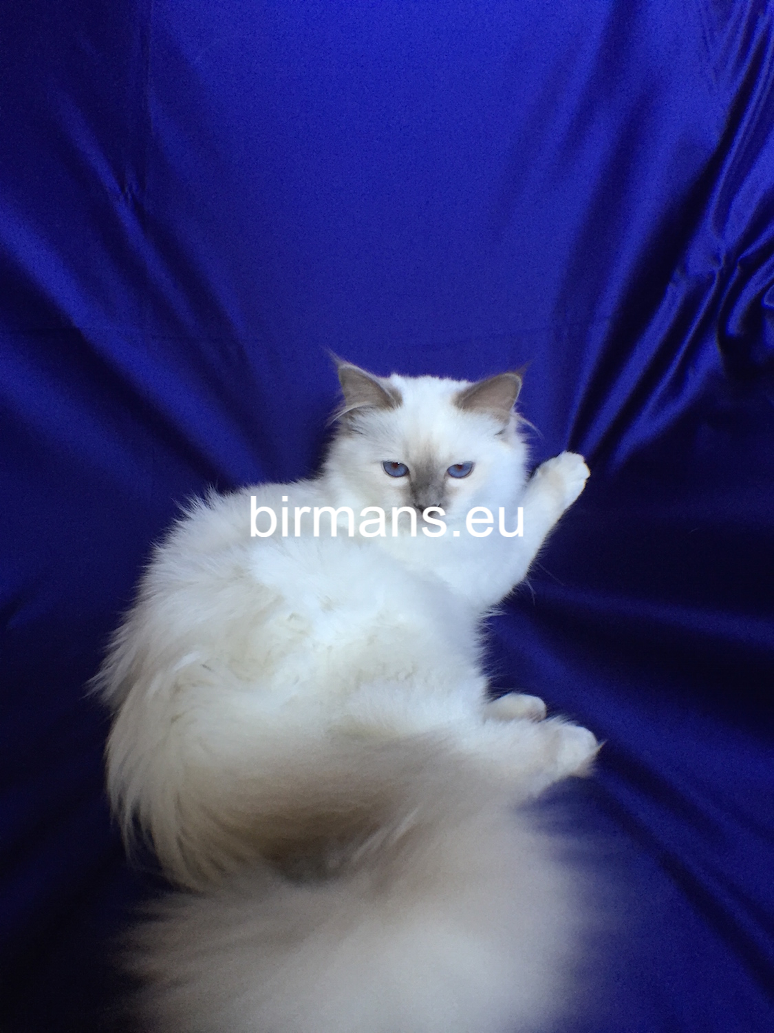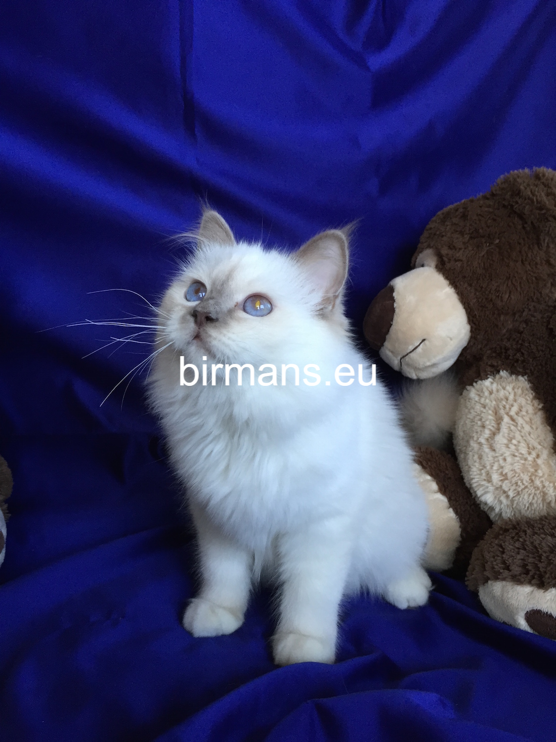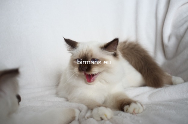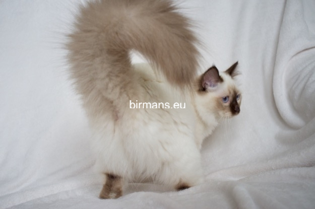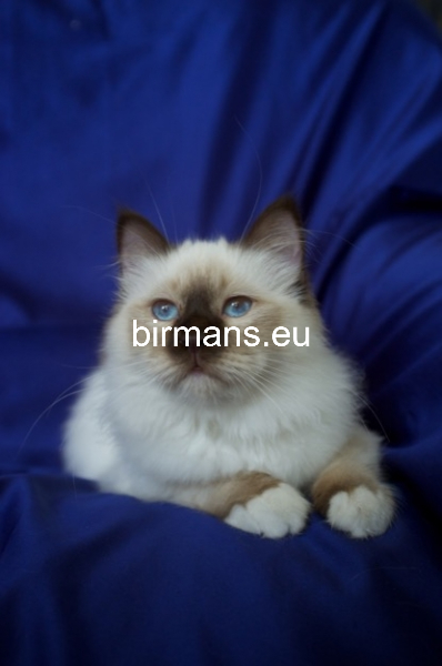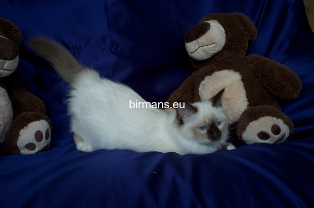 Los padres de Julia son el macho campeón del mundo Azzurro dei Baffi Buffi y Blue Sky Doroty, que es nuestra primera gata Birmana. El aspecto con carácter de Julia es aún más especial por sus rasgos atigrados, muy poco frecuentes en los tonos chocolate.