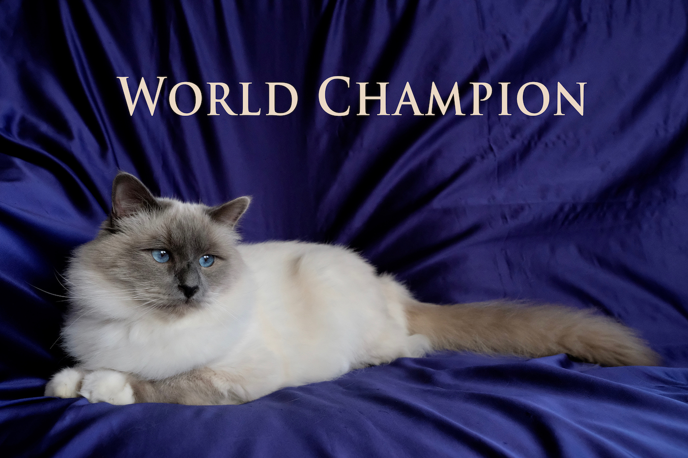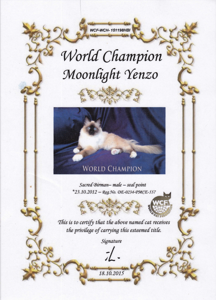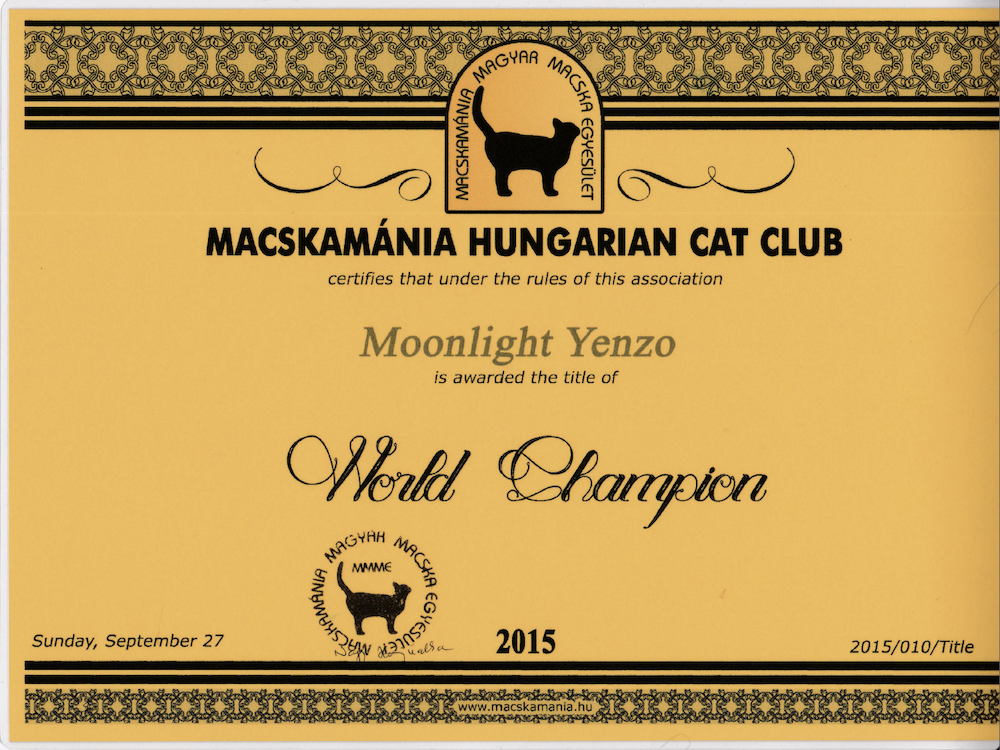 Es un verdadero gatito mimoso, que se acurruca a tu lado por la noche para dormir, y en las exposiciones ha devuelto el escrutinio de los jueces con un dulce ronroneo. Un orgulloso miembro de nuestra familia, ahora retirado tras ganar el título de Campeón del Mundo.